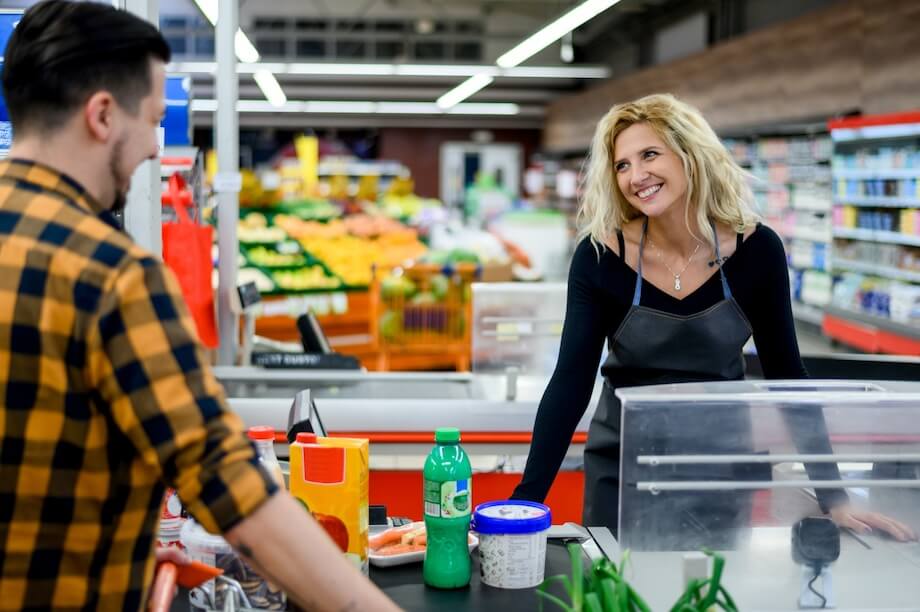 Kobieta na zakupach z wózkiem pełnym jedzenia