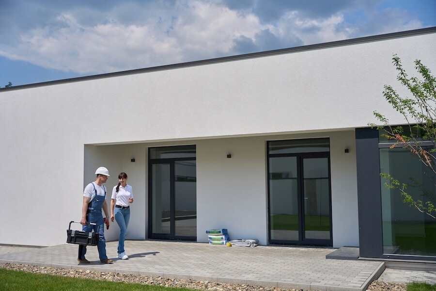 Dom-„kostka” ma prostą, zwartą bryłę, płaski lub prawie płaski dach i rytmiczne otwory okienne. Najlepiej służą mu materiały i zabiegi, które tę geometrię podkreślają zamiast ją komplikować. Oznacza to redukcję detalu, unikanie nadmiaru faktur oraz pracę poziomymi podziałami i starannie zaprojektowanymi „pasami” materiałów. Współczesne realizacje chętnie łączą gładkie tynki z akcentami z betonu, drewna lub płyt kompozytowych, aby ocieplić wizualnie surową formę i zachować jej modernistyczny charakter.
