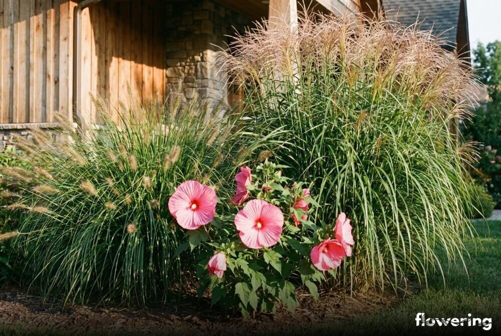 - Trawy ozdobne: Rozplenice czy miskanty dodają lekkości ciężkim kwiatom hibiskusa bagiennego.