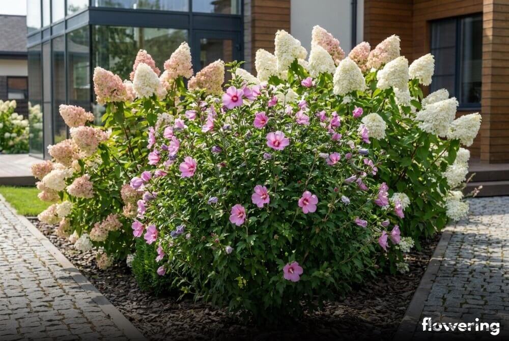 - Hortensje bukietowe: Ich białe lub różowiejące kwiatostany świetnie kontrastują z egzotycznymi kwiatami ketmii.