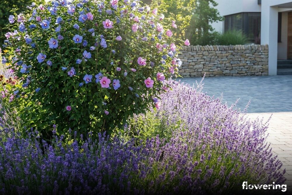 - Lawenda i Perowskia: Fioletowe łany tych roślin pięknie podbijają kolorystykę odmian o niebieskich i różowych kwiatach.