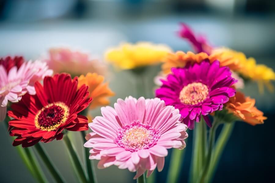 - Wilgotność: Gerbery lubią umiarkowaną wilgotność powietrza. Można ją zwiększyć, umieszczając doniczki na tacach z mokrymi kamykami.