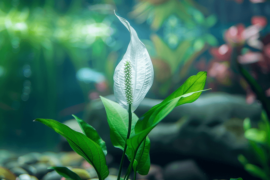 Skrzydłokwiat (Spathiphyllum) to roślina pochodząca z tropikalnych regionów Ameryki Południowej. Choć nie jest typową rośliną wodną, wykazuje zdumiewającą zdolność adaptacji do środowiska akwariowego. Skrzydłokwiat charakteryzuje się eleganckimi, lancetowatymi liśćmi o intensywnie zielonym kolorze oraz charakterystycznymi białymi kwiatami przypominającymi kształtem kalie.