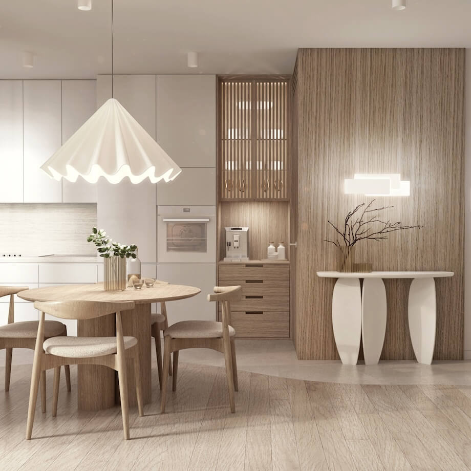 – używaj podobnych materiałów w różnych pomieszczeniach, np. drewna, kamienia czy metalu, aby wnętrze było spójne i harmonijne. - Balans neutralnych i akcentujących elementów