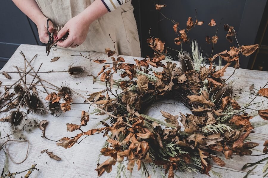 • obręcz ze słomy lub metalu, drut florystyczny i sekator