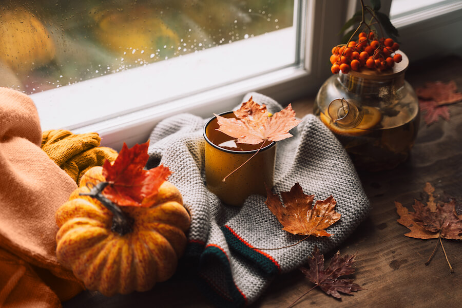 Girlanda liści wokół okna ze świecami na parapecie