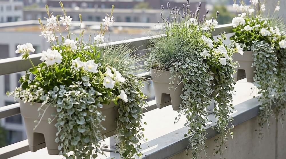Monochromatyczne kompozycje to szczyt elegancji. Połączenie srebra z bielą sprawia, że balkon wygląda czysto, nowocześnie i optycznie na większy. To idealna propozycja na wieczory – białe kwiaty i srebrne liście najlepiej odbijają światło księżyca lub miejskich latarni, „świecąc” w półmroku.