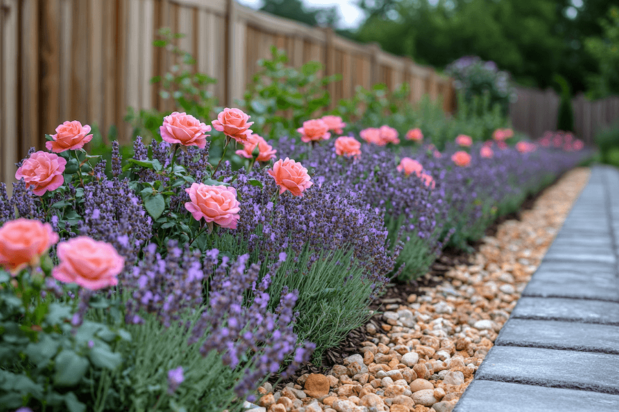 Aby uzyskać taki efekt, warto posadzić krzewy róż w centralnej części rabaty, a przed nimi i po bokach umieścić kępy lawendy i szałwii. Można wybrać róże w odcieniach pastelowych, które będą pięknie kontrastować z intensywnym fioletem ziół.