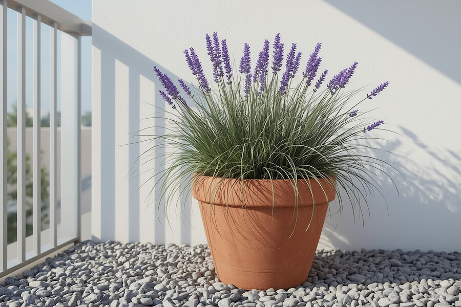 To mały „ogród skalny” w donicy, który wymaga minimum podlewania. W szerokiej misie 45–55 cm lawenda tworzy centralny akcent, a rozchodniki i rojniki wypełniają przestrzeń u podstawy, podkreślając sucholubny charakter zestawu. Kluczem jest mieszanka podłoża: 50% ziemi ogrodowej, 30% grysu 2–8 mm, 20% piasku; drenaż na dnie to konieczność. Kamienie—otoczaki lub łupki—układa się promieniście od lawendy, tworząc naturalną, „spływającą” strukturę.