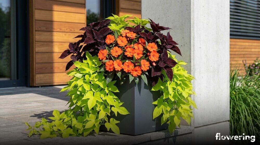 Łączenie niecierpków z roślinami o dekoracyjnych liściach to najbezpieczniejszy sposób na elegancką aranżację. Zieleń (lub inne kolory liści) uspokaja kompozycję i stanowi tło, które podbija intensywne barwy kwiatów.