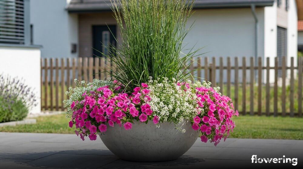- Supertunia Vista: Absolutny numer jeden do łączenia z Vertigo. Odmiany takie jak 'Silverberry’ (biała z różowym środkiem) lub 'Bubblegum’ (intensywnie różowa) tworzą u stóp trawy gigantyczne, kwitnące poduchy.
