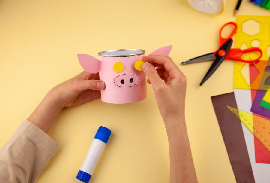 Do wykonania tej wersji skarbonki potrzebna jest czysta plastikowa butelka o pojemności 1–1,5 l, nożyczki, klej na gorąco, farby akrylowe i cztery nakrętki. Pierwszy etap to przygotowanie korpusu – butelkę należy przeciąć wzdłuż na wysokości 1/3 od góry, tworząc otwór na monety. Dolna część stanowi tułów świnki, a górna (odwrócona do góry dnem) imituje głowę.