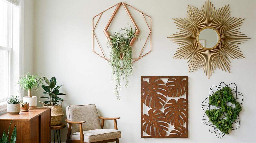 Nowoczesne metalowe ozdoby na ścianę do salonu łączą surowość miedzi, mosiądzu i stali z organicznymi dodatkami, takimi jak mech chrobotek czy rośliny powietrzne. Samodzielnie wykonane geometryczne kwietniki, loftowe półki z blachy oraz ażurowe panele corten stanowią wyraziste akcenty w industrialnych wnętrzach. Przestrzenne formy z drutu i metalowych arkuszy wprowadzają do pomieszczenia nowoczesny design oraz unikalną grę świateł i cieni.