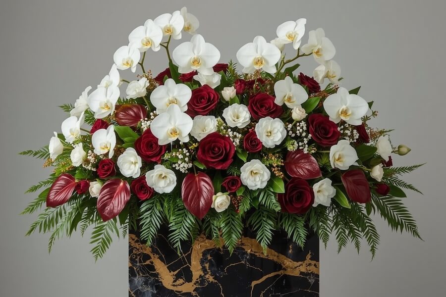 Gładkie, porcelanowe płatki storczyków w duecie z lakierowaną taflą anturium tworzą niezwykle współczesny obraz. Orchidea kojarzona jest z doskonałością i elegancją, natomiast anturium symbolizuje trwałą miłość i szacunek. Gdy biel spotyka głęboką czerwień, powstaje kompozycja wyrazista, lecz wciąż pełna subtelności. Florysta zazwyczaj mocuje pojedyncze gałązki falenopsisa wysoko, tak by unosiły się niczym motyle, a masywne sercowate anturium układa poniżej, stabilizując konstrukcję.