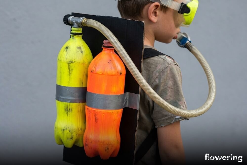 Konstrukcja tego stroju jest bliźniaczo podobna do plecaka odrzutowego, jednak kluczowa jest tutaj kolorystyka i dodatki. Zamiast srebra, użyj żywych, ostrzegawczych kolorów, takich jak żółty, neonowy zielony lub pomarańczowy, które kojarzą się ze sprzętem do nurkowania. Butelki połącz ze sobą pionowo, a następnie zamocuj na czarnym panelu z kartonu lub pianki.