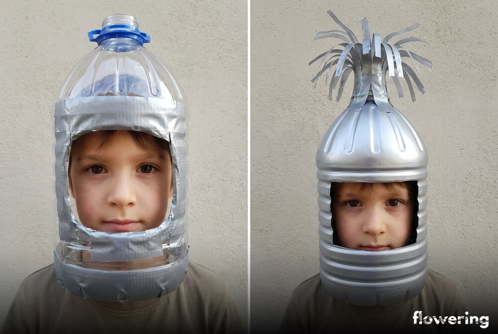 Taki hełm jest idealny dla astronauty (można go zostawić przezroczystym) lub rycerza (po pomalowaniu na srebrno i doklejeniu „pióropusza” z pociętej butelki na czubku). Ważne jest, aby dolną krawędź hełmu, która opiera się na ramionach dziecka, zabezpieczyć miękkim materiałem lub grubą warstwą taśmy, by nie ocierała skóry.
