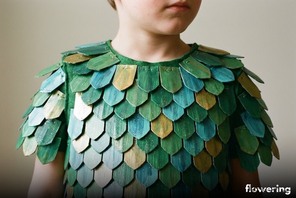 • Wycinanie łusek: Z arkusza wytnij dziesiątki owalnych elementów w kształcie litery „U” lub tarczy. Wielkość dostosuj do skali stroju (np. 5×5 cm).