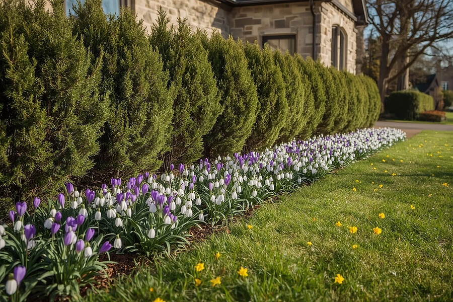Te krzewy mają sens pod tujami wtedy, gdy miejsce nie jest ekstremalnie suche i da się zapewnić kwaśne, chłodne podłoże. Najlepiej sadzić je przed linią tui, w pasie, który łapie poranne słońce i popołudniowy półcień, 40–80 cm od pni. Skimmia dorzuca zimowe jagody i pachnące kwiaty wczesną wiosną (pamiętaj, że większość odmian jest dwupienna – do owoców potrzebna jest roślina męska i żeńska). Pieris kusi różowymi pąkami i białymi gronami wiosną, a różaneczniki robią gęste, zimozielone bloki i widowiskowo kwitną. Wszystkie mają płytki system korzeniowy, więc konkurują z tujami – dlatego liczy się przygotowanie stanowiska i porządna ściółka.