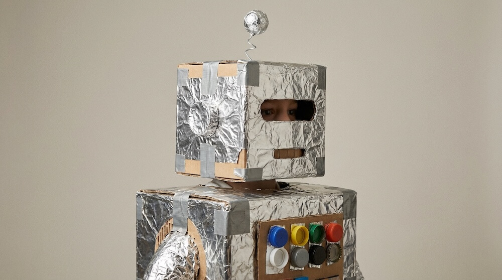 Ruchome ręce robota stworzysz z elastycznych rur wentylacyjnych (dostępnych w marketach budowlanych) lub po prostu nakładając na ręce mniejsze, podłużne pudełka. Ciekawym dodatkiem jest antena na głowie – zrobisz ją z drutu i piłeczki pingpongowej lub starej sprężyny.