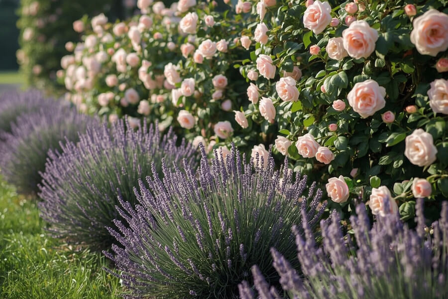 Zestawienie lawendy i róż działa nie tylko wizualnie – silny zapach odstrasza mszyce, a miododajne kwiaty przyciągają pszczoły i motyle. Żeby rabata kwitła od czerwca aż do pierwszych przymrozków, dobrze jest podsypać róże kompostem z dodatkiem mączki rogożowej, a lawendę wczesną wiosną lekko nawozić nawozem do roślin śródziemnomorskich.